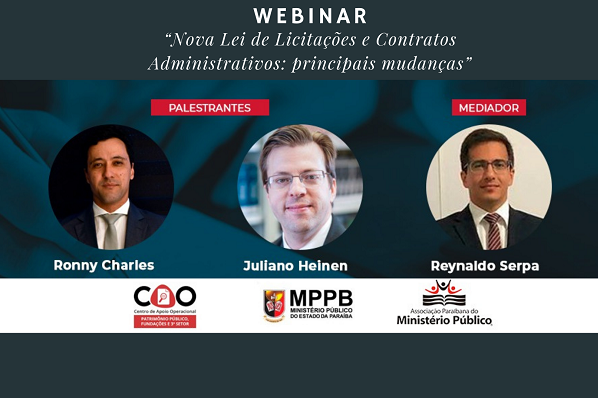 O Ministério Público da Paraíba está com inscrições abertas para o webinar “Nova Lei de Licitações e Contratos Administrativos: principais mudanças”, que acontecerá na próxima quinta-feira (18/11), a partir das 9h30. É direcionado, principalmente, a membros e servidores da instituição (por meio da plataforma Zoom), mas outros profissionais e cidadãos interessados na temática poderão acompanhar simultaneamente, pelo canal do Nead/MPPB no YouTube (acesse AQUI).